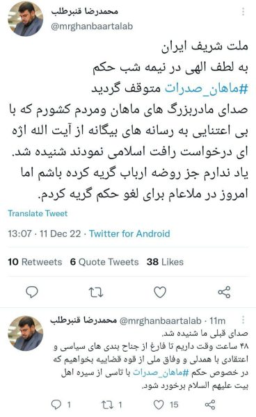 یاد ندارم جز روضه ارباب گریه کرده باشم اما امروز در ملاعام برای لغو حکم گریه کردم. صدای قبلی ما شنیده شد. ۴۸ ساعت وقت داریم تا فارغ از جناح بندی های سیاسی و اعتقادی با همدلی و وفاق ملی از قوه قضاییه بخواهیم که در خصوص حکم ماهان صدرات با تاسی از سیره اهل بیت علیهم السلام برخورد شود./انتخاب