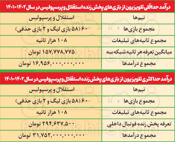 خلاصه اینکه طبق تعرفه رسمی صدا و سیما تنها برای پخش زنده ۶۰ بازی سرخابی ها در فصل جاری تلویزیون بیش از ۳۱ هزار میلیارد تومان درآمد دارد حالا فرض کنید تلویزیون برای جذب آگهی بیشترچوب حراج به آنتن خودش بزند، فرضا ۹۰ درصد یعنی تنها ۱۰ درصد از درآمد ممکن را کسب کند رقم ناقابل ۳ هزار میلیارد تومان