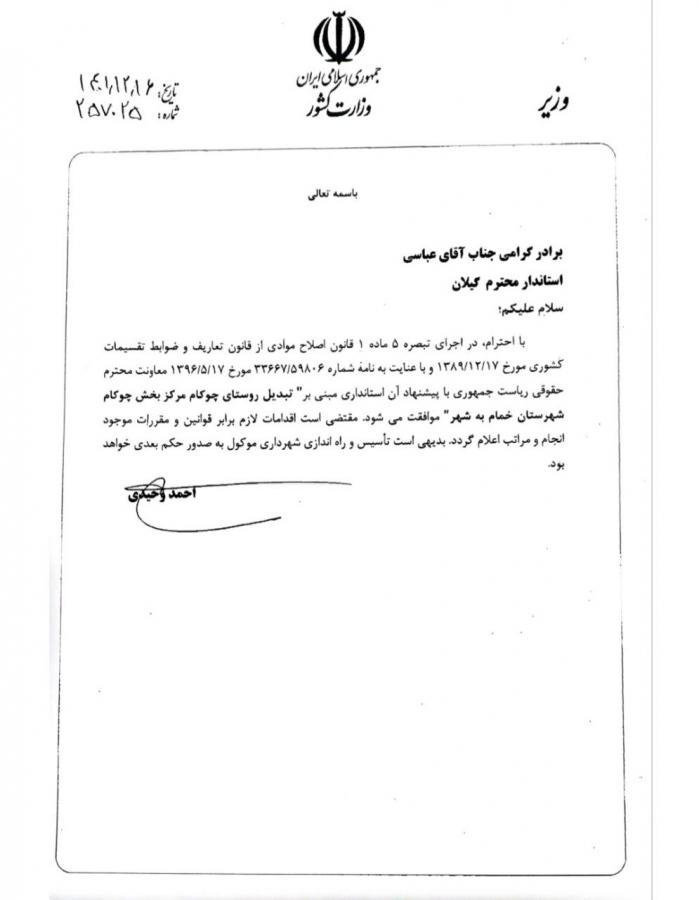 در اجرای تبصره ۵ ماده ۱ قانون اصلاح موادی از قانون تعاریف و ضوابط تقسیمات کشوری مورخ ۱۳۸۹/۲/۱۷ و با عنایت به نامه شماره ۳۳۶۶۷/۵۹۸۰۶ مورخ ۱۳۹۶/۵/۱۷ معاونت محترم حقوقی ریاست جمهوری با پیشنهادات آن استانداری مبنی بر «تبدیل روستای چوکام مرکز بخش چوکام شهرستان خمام، روستای ضیابر مرکز بخش ضیابر شهرستان صومعه سرا و روستای طاهر گوراب مرکز بخش طاهرگوراب به شهر» موافقت می شود.