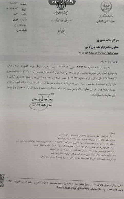 به گزارش تالشان نیوز صادرات کیوی ایران از تاریخ ۷ مهرماه ۱۴۰۴ خورشیدی به طور رسمی آغاز خواهد شد و گمرکات کشور برای خروج این محصول بازگشایی میشوند. این تصمیم در جلسهای رسمی یروز (یکشنبه ۲۳ شهریورماه ۱۴۰۴) در وزارت جهاد کشاورزی اتخاذ شد.